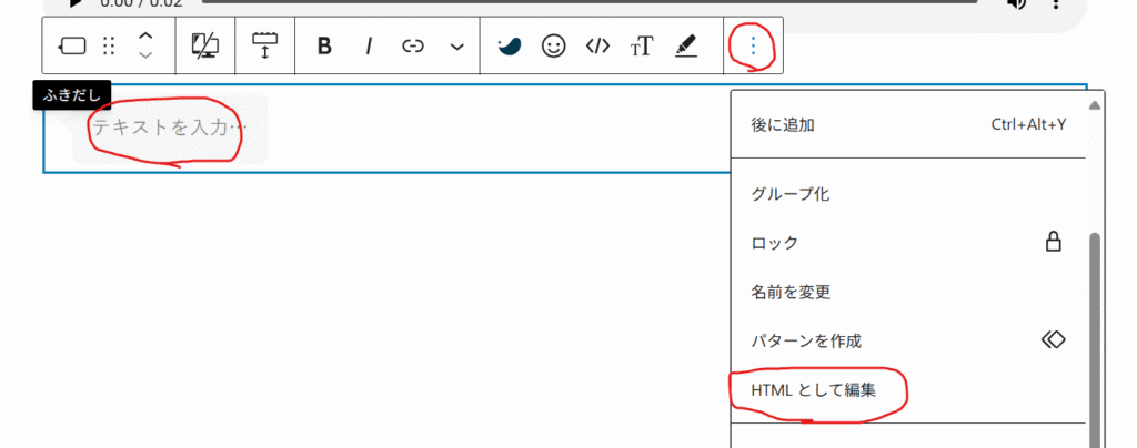 ふきだしを選択し、「…」をクリックしたら、「HTMLとして編集」をクリックします。