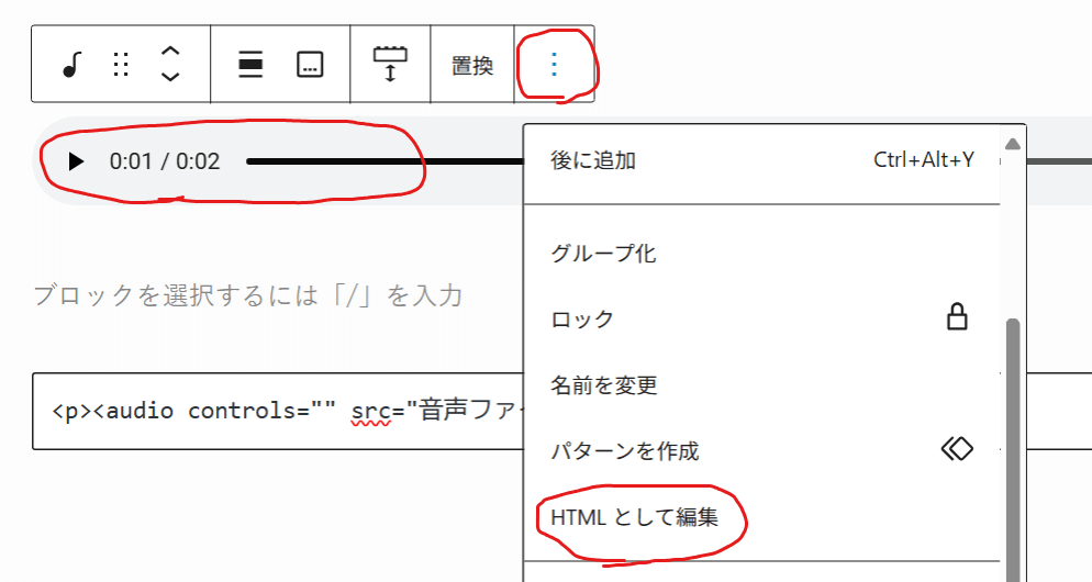 音声ファイルを選択し、「…」をクリックしたら、「HTMLとして編集」をクリックします。