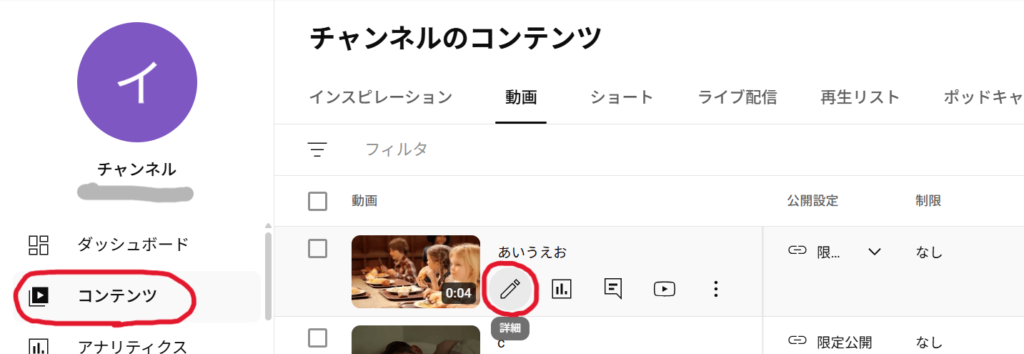 チャンネルのメニューバーから「コンテンツ」を選択し、該当する動画にカーソルを合わせて「ペンマーク」をクリックします。