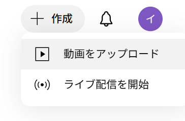 自身のYouTubeチャンネルの右上にある「作成」をクリックし、「動画をアップロード」をクリックします。