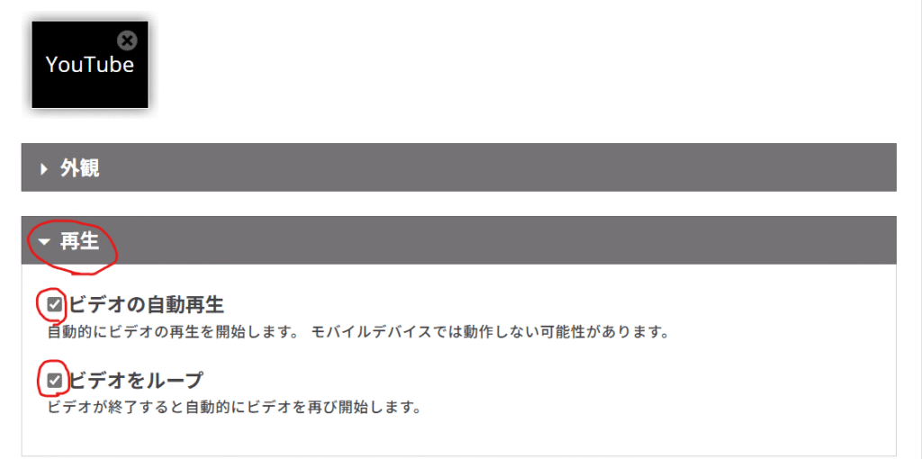 動画を挿入出来たら、再生設定を開き、「ビデオの自動再生」と「ビデオをループ」にチェックを入れます。