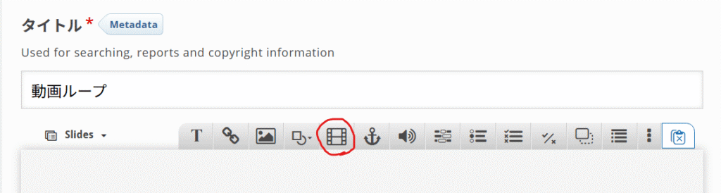 Course Presentationの編集画面を開いたら、タイトルを適当に記入し、上のメニューバーから「ビデオマーク」をクリックします。