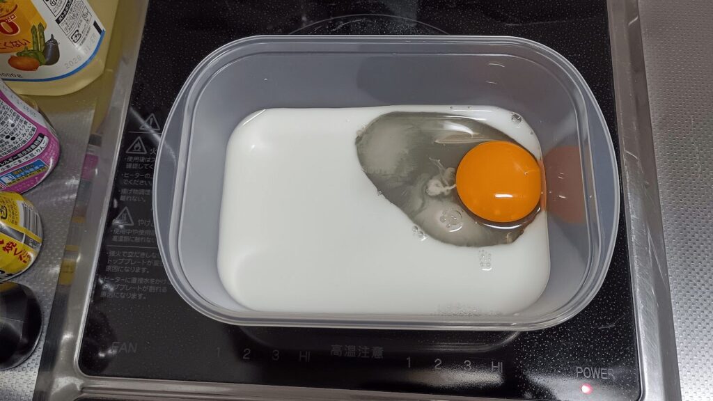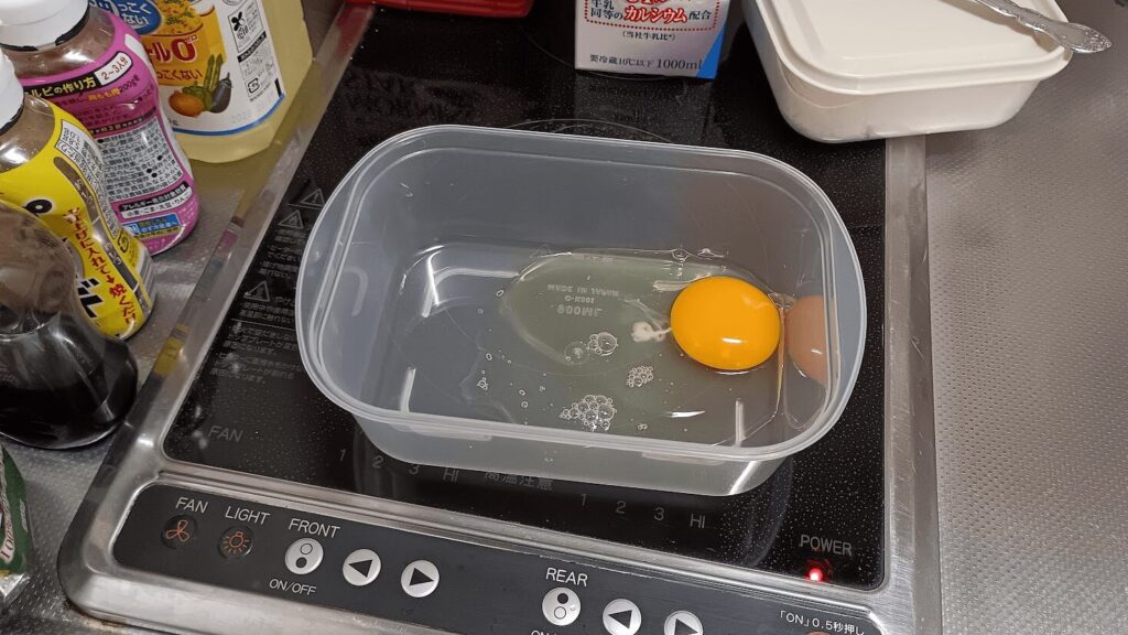 まずは、耐熱容器に卵を割ります。