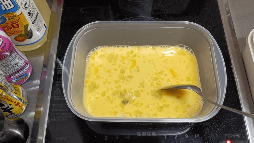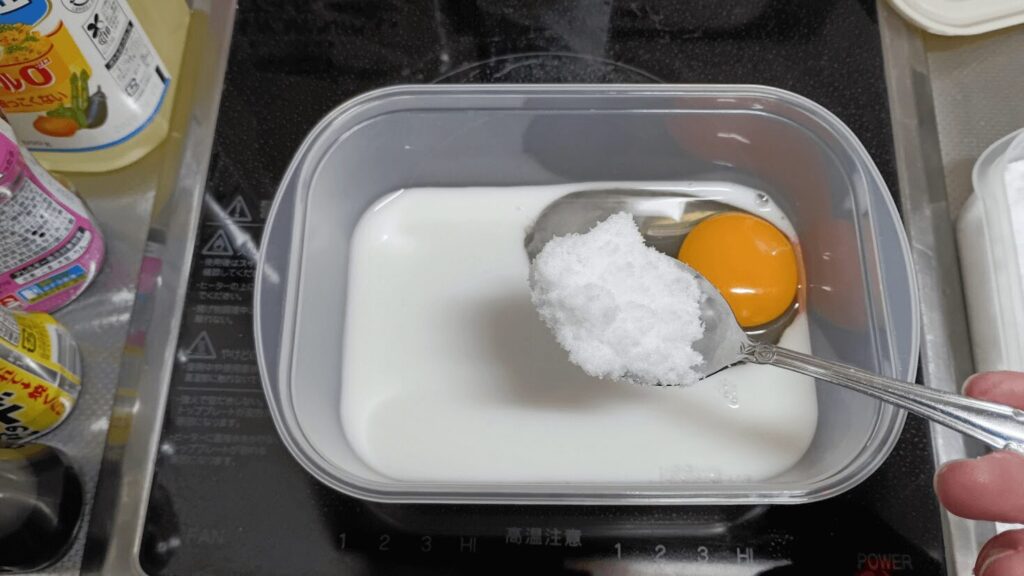 ちなみに、卵を入れたら卵だけで溶いて、その後に牛乳と砂糖を足す方が綺麗に混ざる気がします。