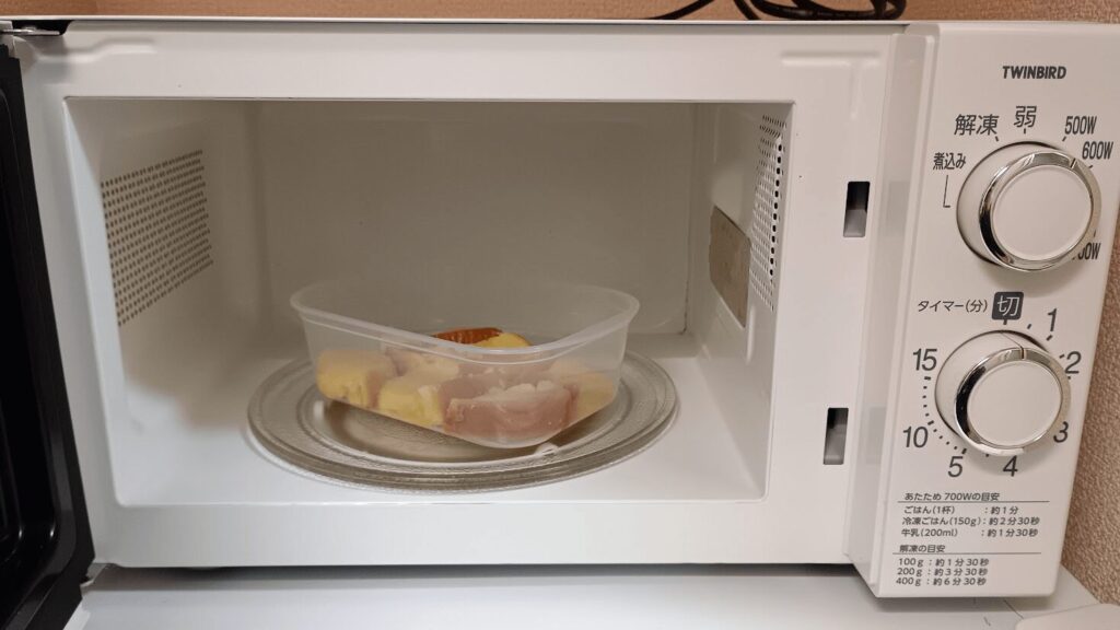 ラップをせずに電子レンジ(500W)で3分加熱します。