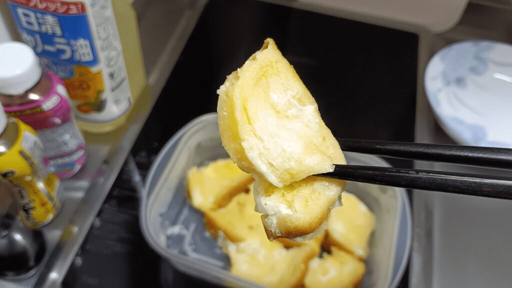 もちろん焼いているわけではないので焼き目は無いし、卵が普通に加熱されている感じの部分はあります。