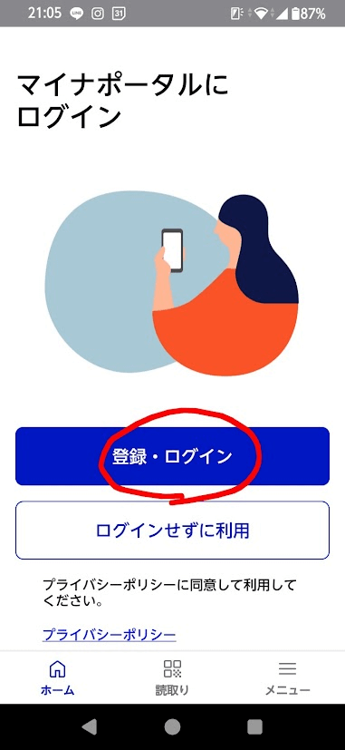 マイナアプリを開き、ホーム画面の「登録・ログイン」をタップします。