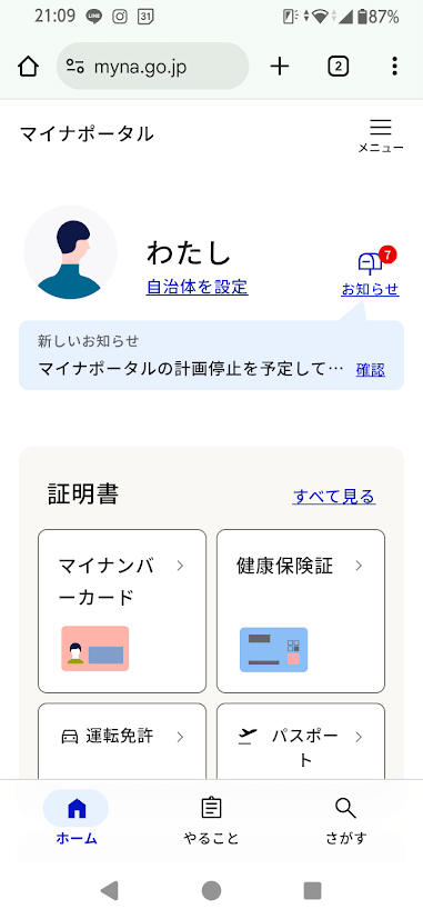 ブラウザで「マイナポータル」と検索してアクセスするか、以下のリンクからアクセスしましょう。