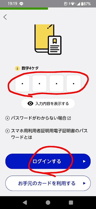 マイナンバーカードのパスワード(半角数字4桁)を入力し、「ログインする」をタップします。