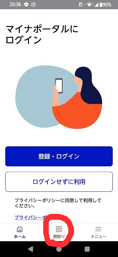 スマホでマイナポータルアプリを開き、読取りボタンを押してパソコン画面のQRコードを読み取ります。