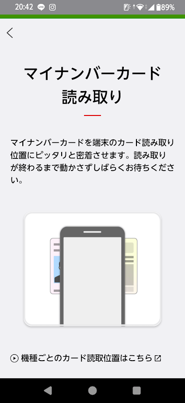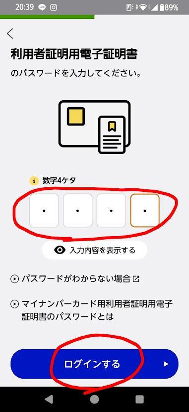 その後はパソコンと同様、マイナンバーカードのパスワードを入力します。