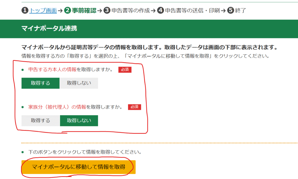 情報を「取得する・取得しない」を選択し、「マイナポータルに移動して情報を取得」をクリックします。