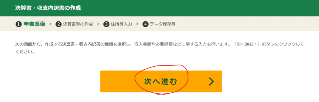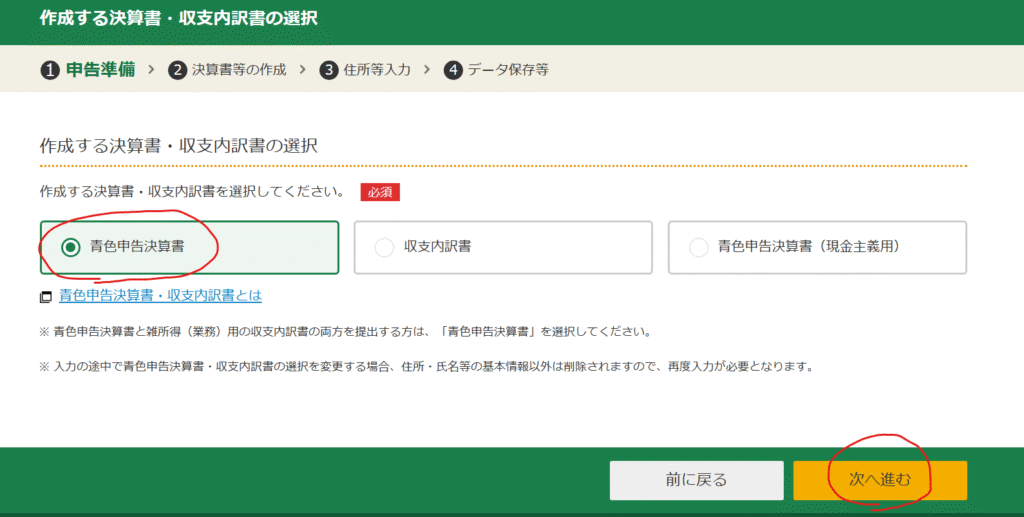 作成する決算書・収支内訳書の選択画面が表示されるので、今回は「青色申告決算書」を選択して「次へ進む」をクリックします。