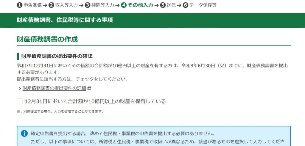 財産債務調書、住民税等に関する事項の確認を行い、「次へ」をクリックします。