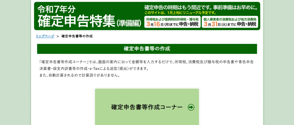 まずは、ブラウザで「確定申告書等作成コーナー」と検索し、国税庁のサイトにアクセスしましょう。