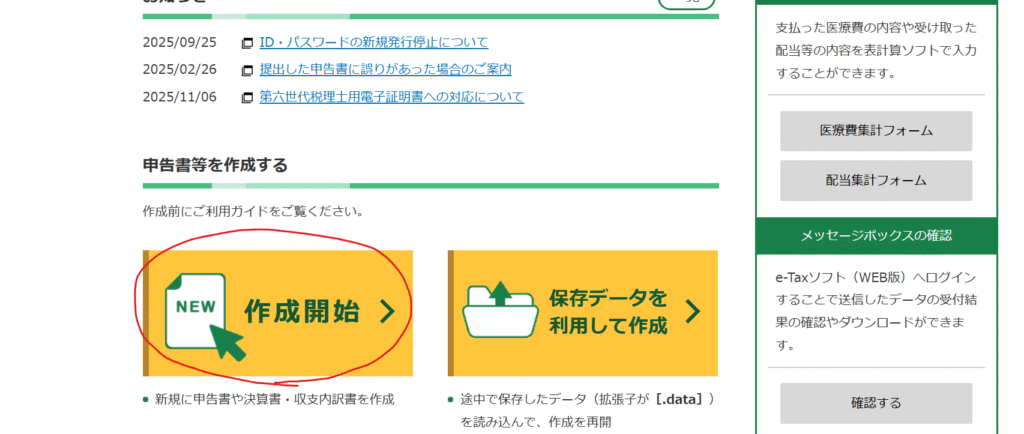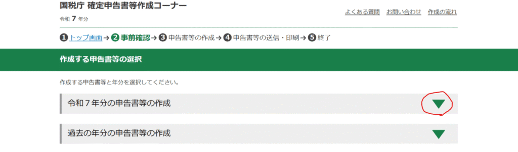 ここでは、「令和7年分の申告書等の作成」をクリックします。