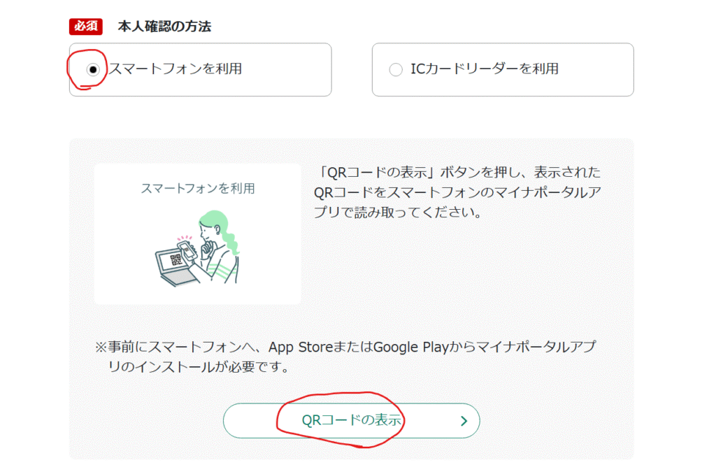 本人確認の画面が表示されたら、「スマートフォンを利用」を選択し、「QRコードの表示」をクリックします。