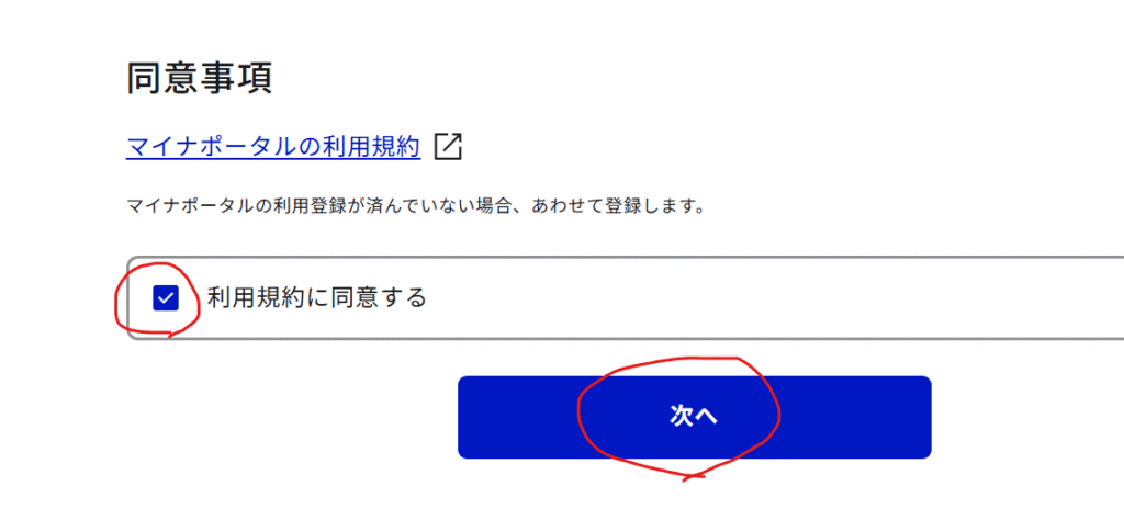利用規約を確認し、「利用規約に同意する」にチェックを入れて「次へ」をクリックします。