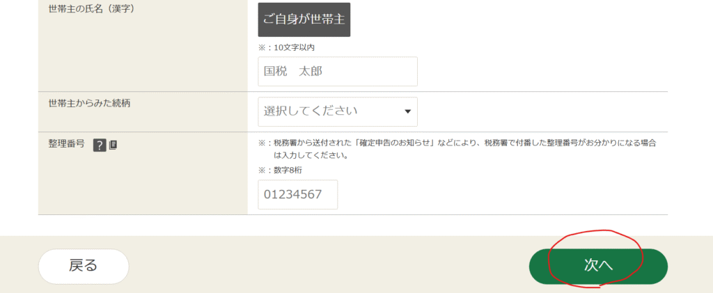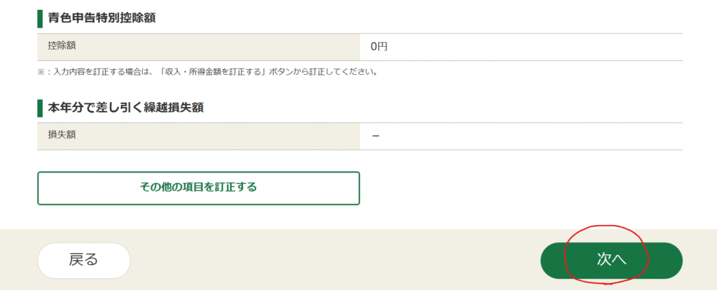 控除等の入力画面が表示されるので、該当箇所がある方はそれぞれ入力し、終わったら「次へ」をクリックします。