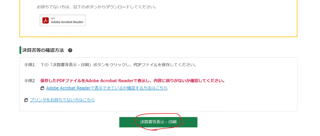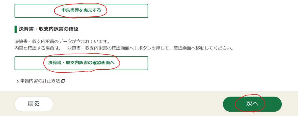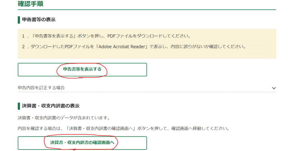 また、「決算書・収支内訳書の確認画面へ」をクリックし、ファイルをダウンロードしましょう。