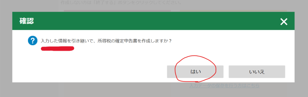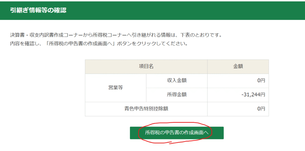 引継ぎ情報を確認し、「所得税の申告書の作成画面へ」をクリックします。
