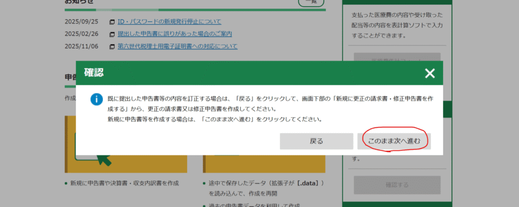 このような画面が出てきた場合、新規に申告書等を作成するので「このまま次へ進む」をクリックします。