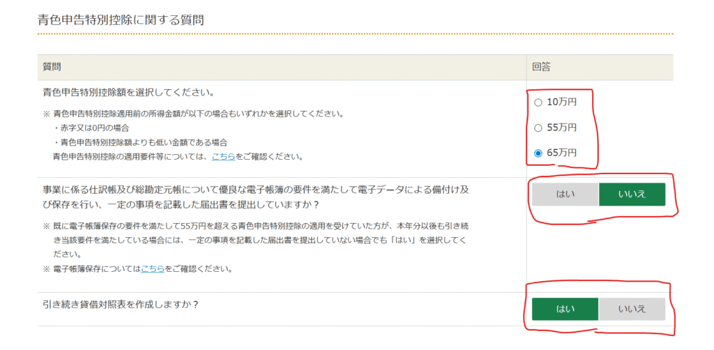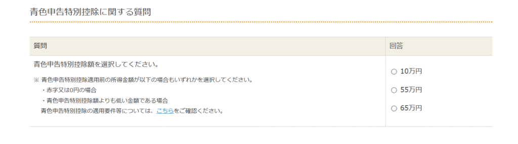続いて、青色申告特別控除額の選択画面が表示されます。