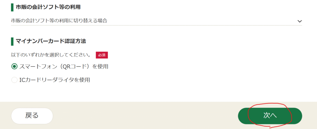 マイナンバーカード認証方法は「スマートフォン(QRコード)」を選択し、「次へ」をクリックします。
