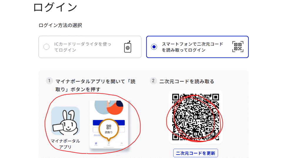 マイナポータルアプリを開いてQRコードを読み取ります。