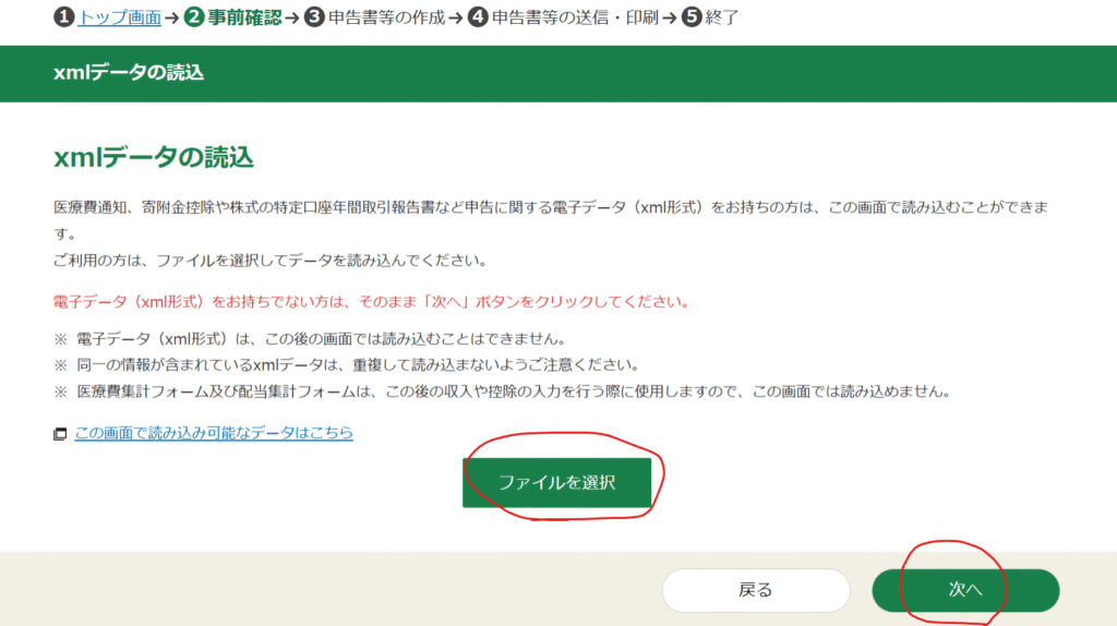 医療費通知、寄附金控除や株式の特定口座年間取引報告書など申告に関する電子データ(xml形式)をお持ちの方は、この画面で読み込むことができます。