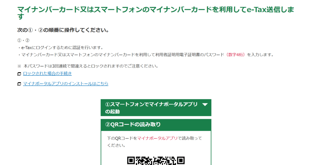 マイナポータルアプリでQRコードを読み込み、6~16桁のパスワードを入力します。