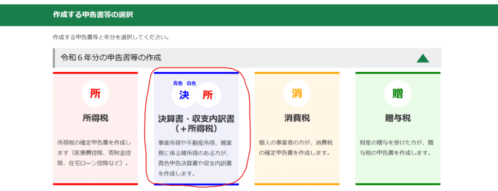 続いて、青色の「決算書・収支内訳書(+所得税)」をクリックします。