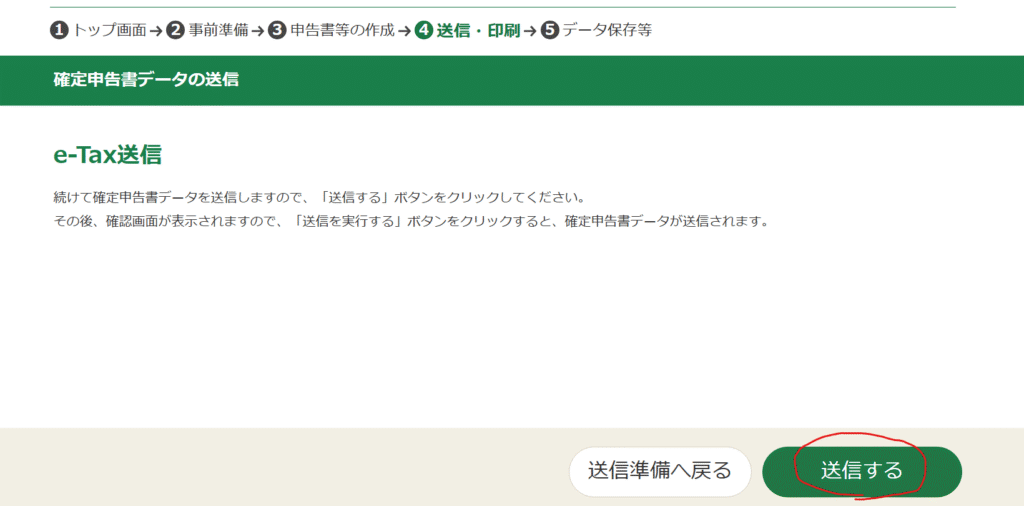 本人確認が完了すると確定申告書データの送信画面に切り替わるので、「送信する」をクリックします。