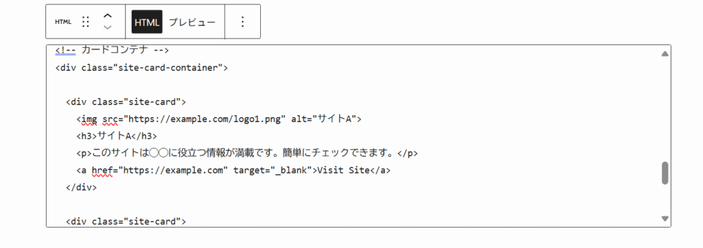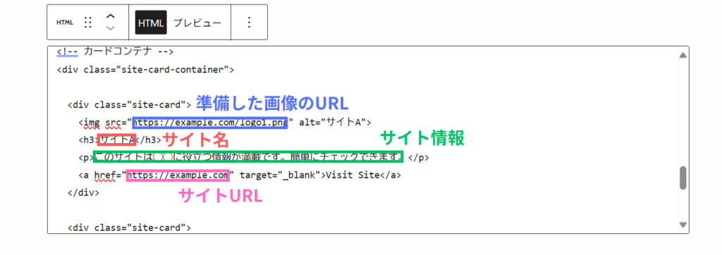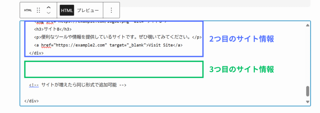 <!– サイトが増えたら同じ形式で追加可能 –>という文字は消しても大丈夫です。