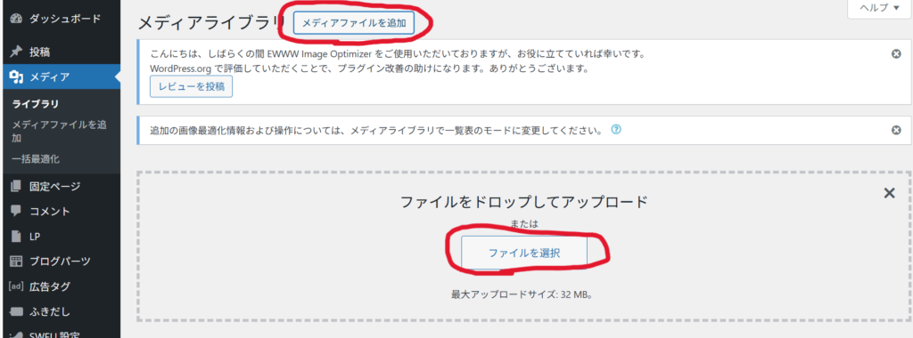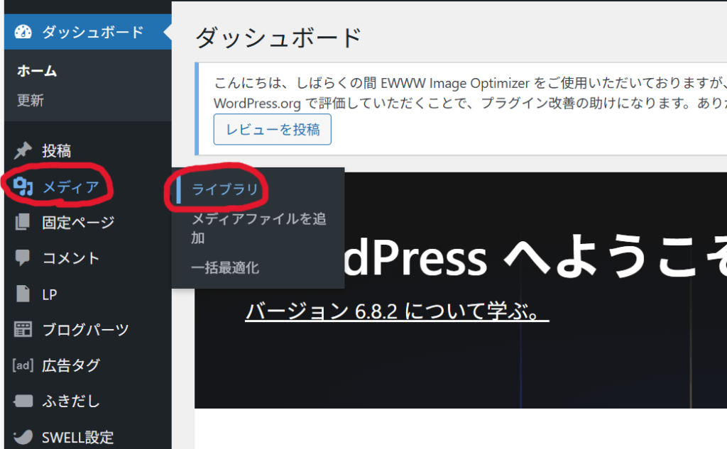 WordPressのダッシュボードから「メディア」→「ライブラリ」と進みます。