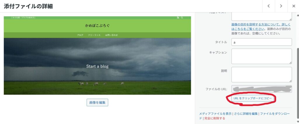 アップロードした画像をクリックし、添付ファイルの詳細画面を開きます。