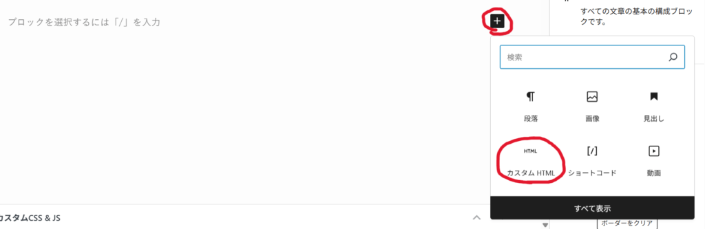 WordPressの記事編集ページで「+」ボタンをクリックし、「カスタムHTML」を選択します。