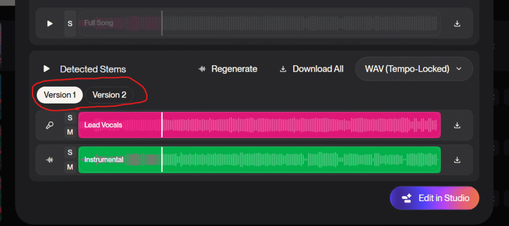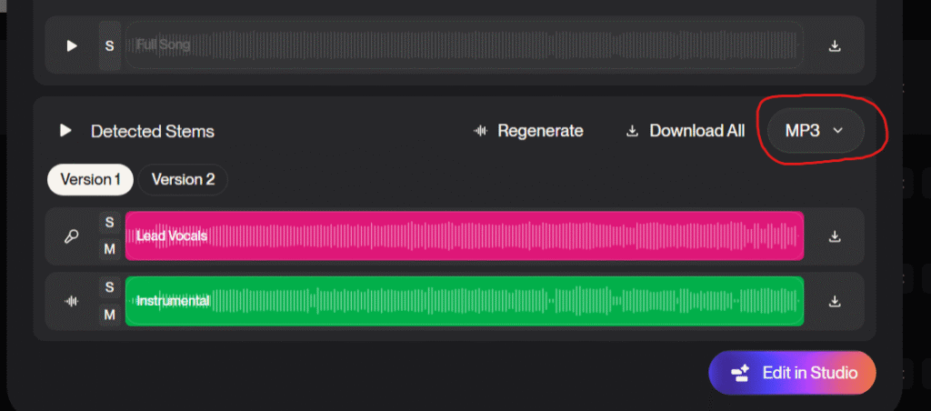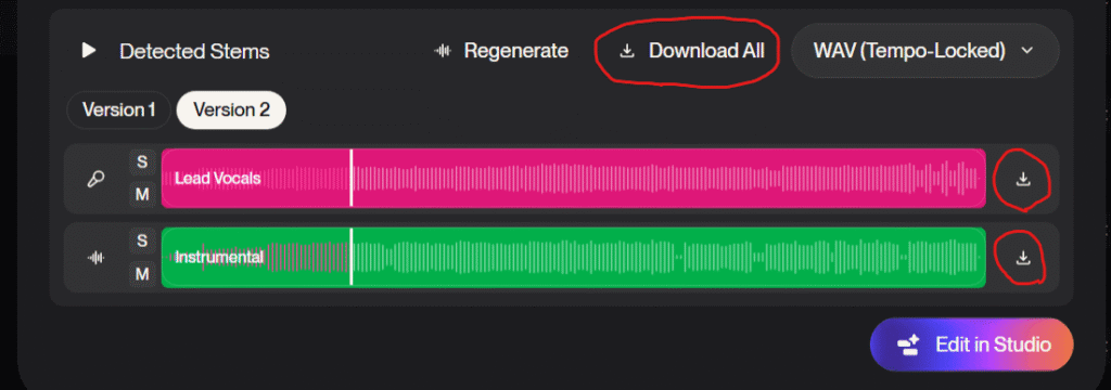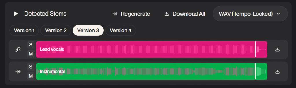 僕はSuno AIで生成した楽曲でリリックビデオを作成する予定なので、「WAV (Tempo-Locked)」、「Version 2」を選択しました。