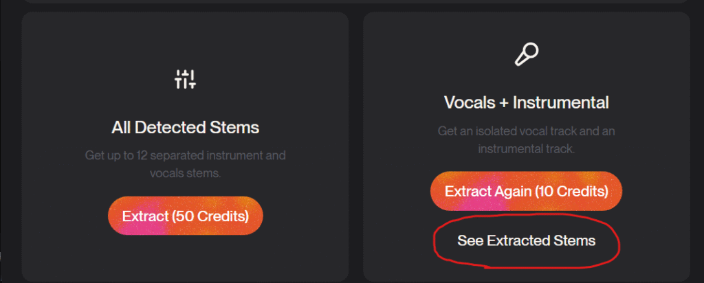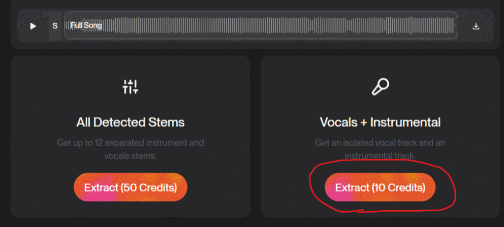 Vocals + Instrumentalの「Extract (10 Credits)」をクリックします。