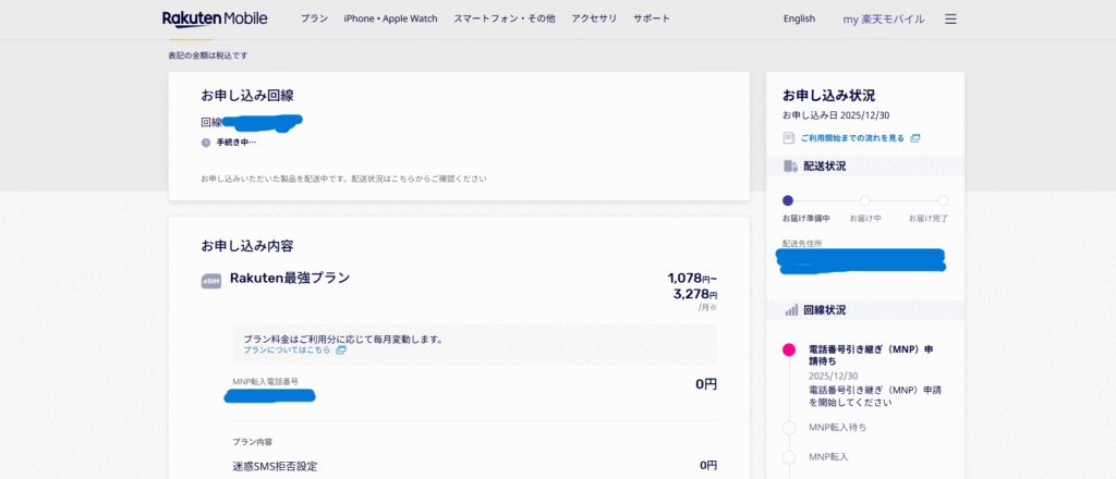 配送状況は「お届け準備中」と表示され、回線状況は「電話番号引継ぎ(MNP)申請待ち」「電話番号引継ぎ(MNP)申請を開始してください」と表示されています。