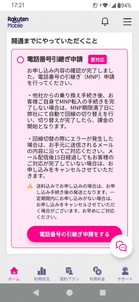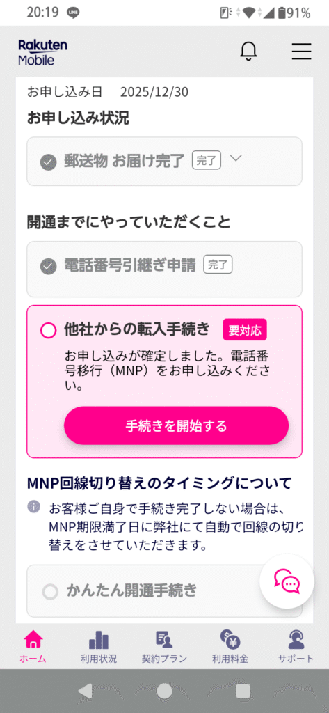 - MNP予約番号を使用して、楽天モバイルで通常の乗り換え手続きをした