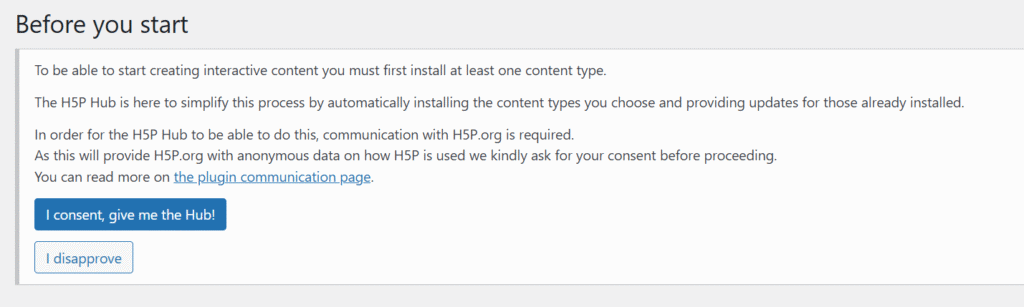 インストールして有効化したら、上のような画面になると思うので、「I consent, give me the Hub!」をクリックします。
