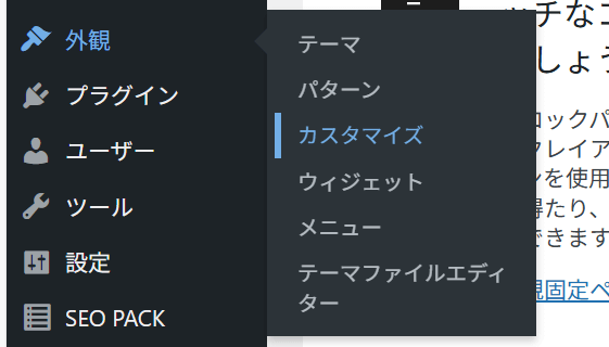 WordPressのダッシュボードから「外観」→「カスタマイズ」と進みます。
