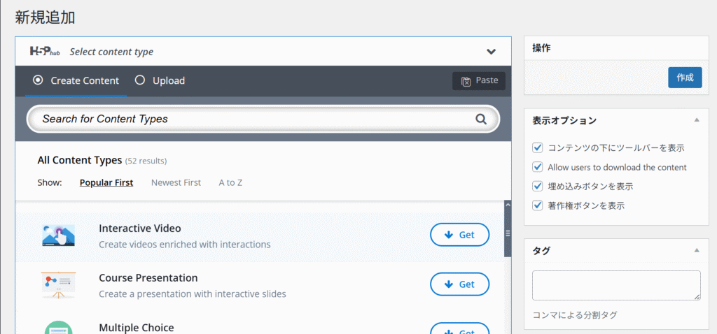 プラグインをインストールしたら、Wordpressのダッシュボードから「H5Pコンテンツ」→「新規追加」と進みます。