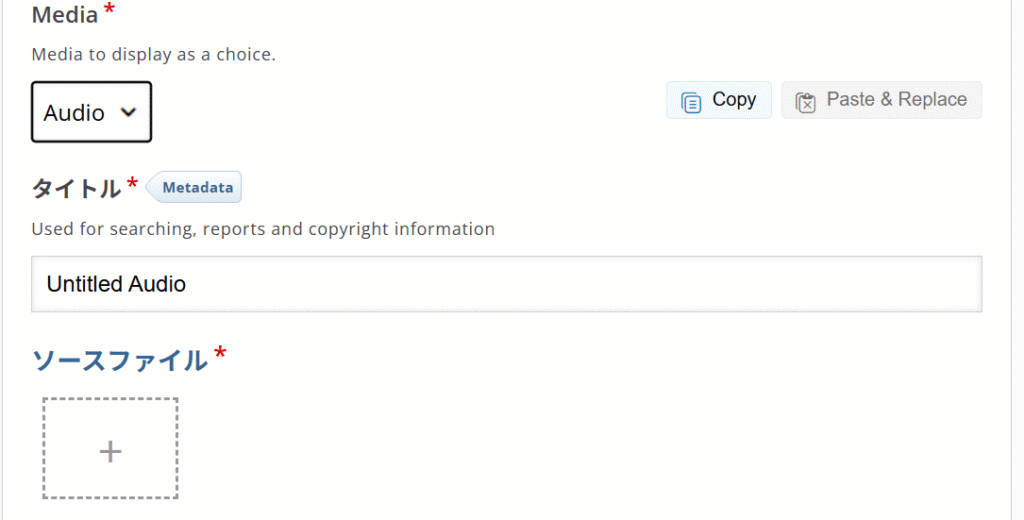 Audioを選択したら、ソースファイルの「+」をクリックします。