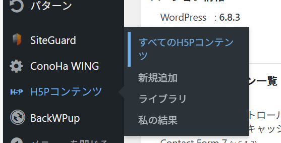 WordPressのダッシュボードから「H5Pコンテンツ」→「すべてのH5Pコンテンツ」と進みます。