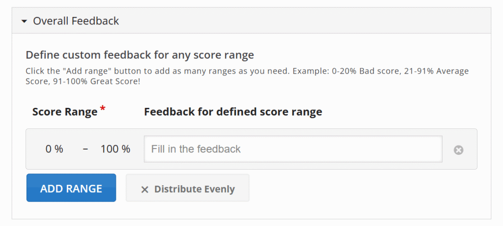その下の「Overall Feedback」という項目の「Score Range」というものは、正答率によって表示されるテキストを指定できるというものです。