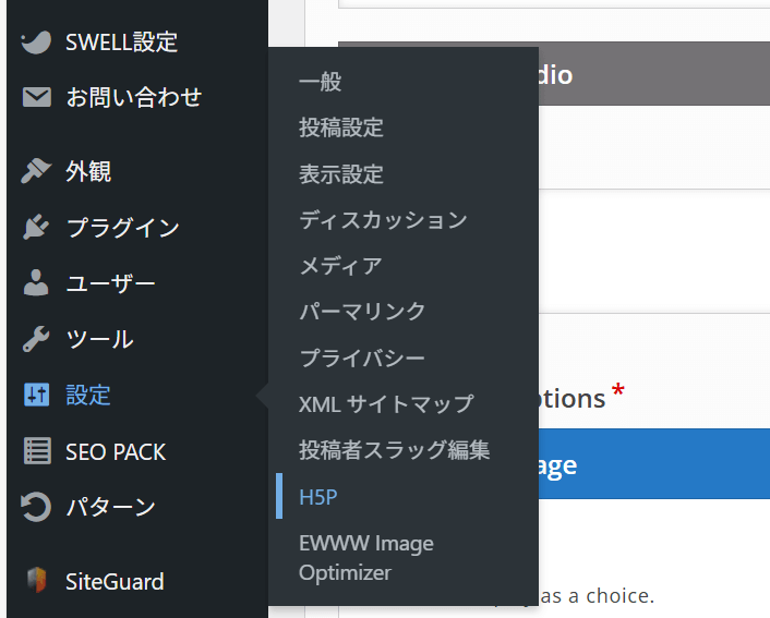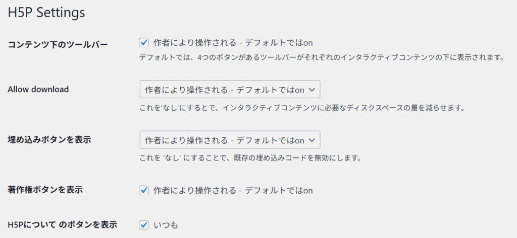 ちなみに、Wordpressのダッシュボードから「設定」→「H5P」と進むと、H5Pの設定ができます。